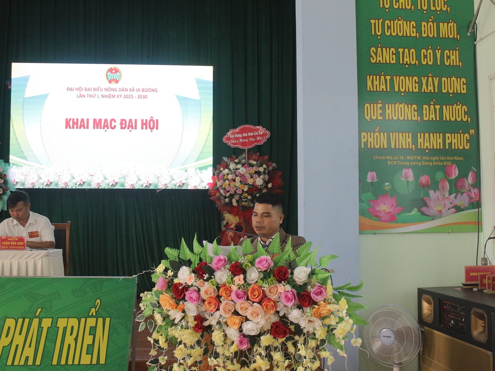 Đồng chí Trần Văn Anh- Phó chủ tịch UBMTTQ xã Ia Boòng nhiệm kỳ 2025-2030 trình bày báo cáo tổng kết nhiệm kỳ 2025-2030
