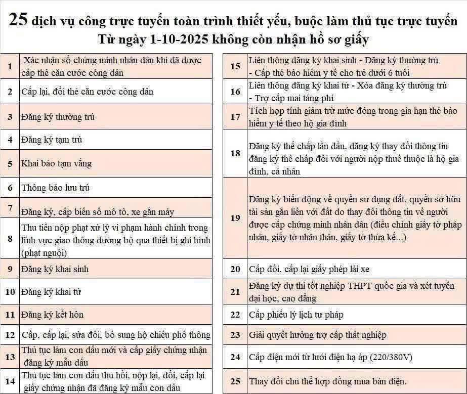 Từ ngày 1-10, các Trung tâm Phục vụ hành chính công trên cả nước sẽ ngừng tiếp nhận hồ sơ giấy đối với 25 dịch vụ công thiết yếu. Người dân sẽ được giải quyết thủ tục hành chính trực tuyến hoàn toàn giúp tiết kiệm thời gian và chi phí.