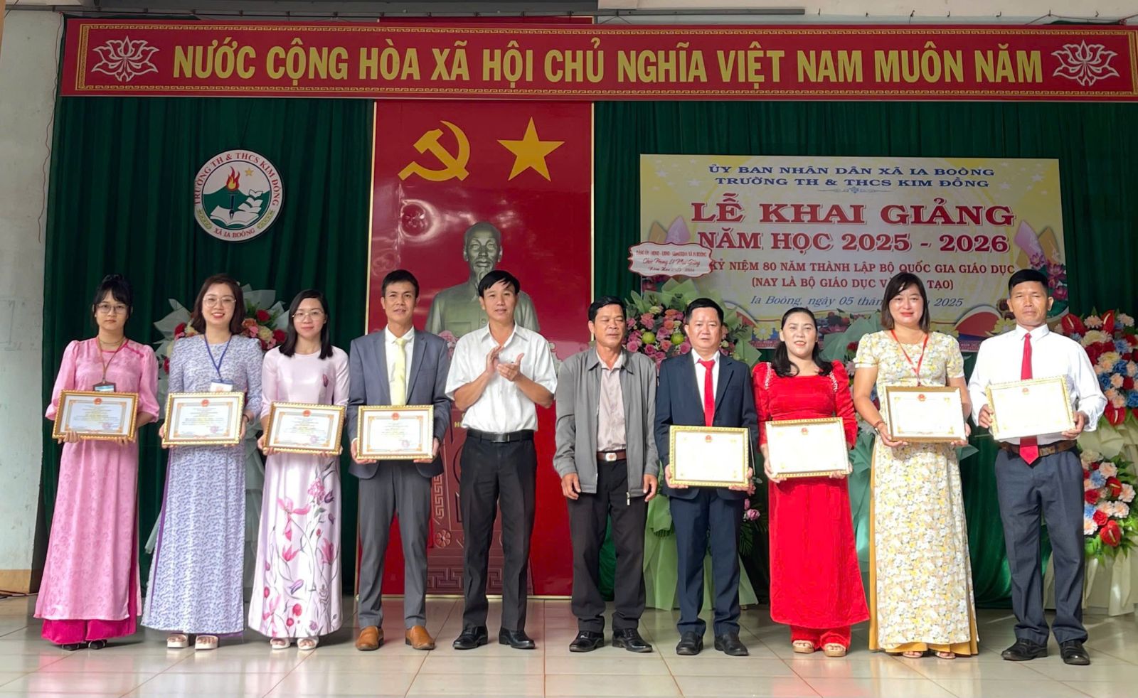 Đồng chí Cù Minh Thông - Phó Chủ tịch UBND xã dự và trao tặng giấy khen cho các thầy cô giáo tại trường TH& THCS Kim Đồng nhân dịp ngày Khai giảng năm học mới