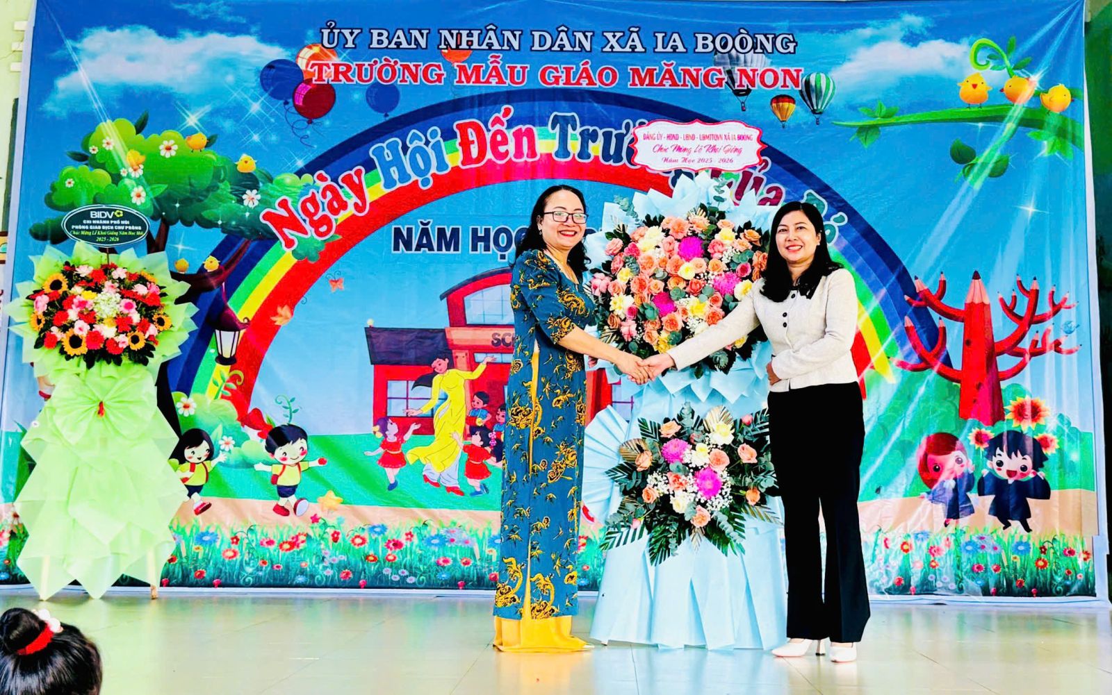 Đồng chí Trương Thị Oanh- Phó Chủ tịch Hội đồng nhân dân xã đến dự và tặng hoa Trường Mẫu giáo Măng Non nhân dịp năm học mới 2025-2026