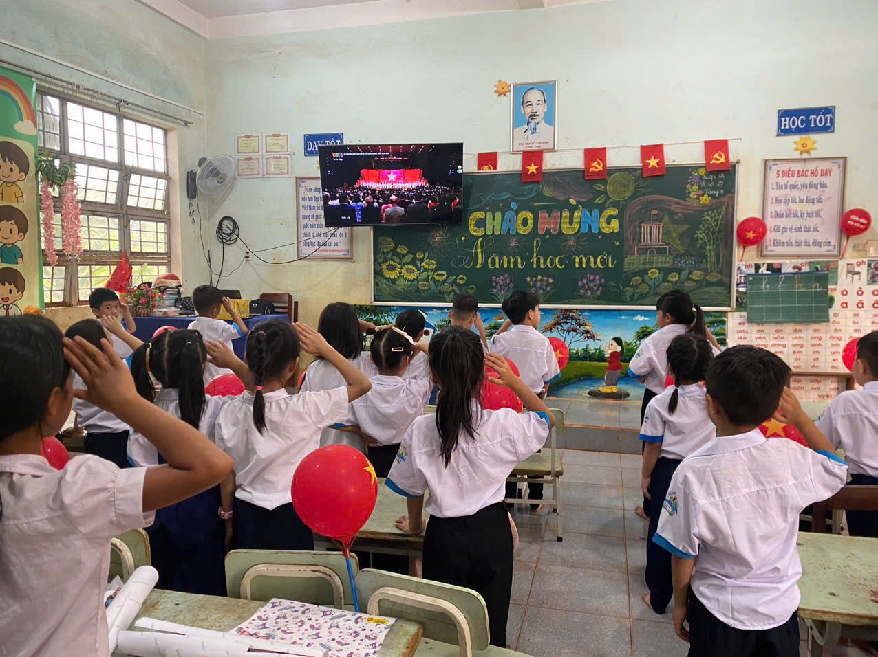 Các em học sinh tham dự lễ Chào cờ cùng cả nước nhân ngày Khai giảng năm học mới 2025-2026 qua màn hình trực tuyến
