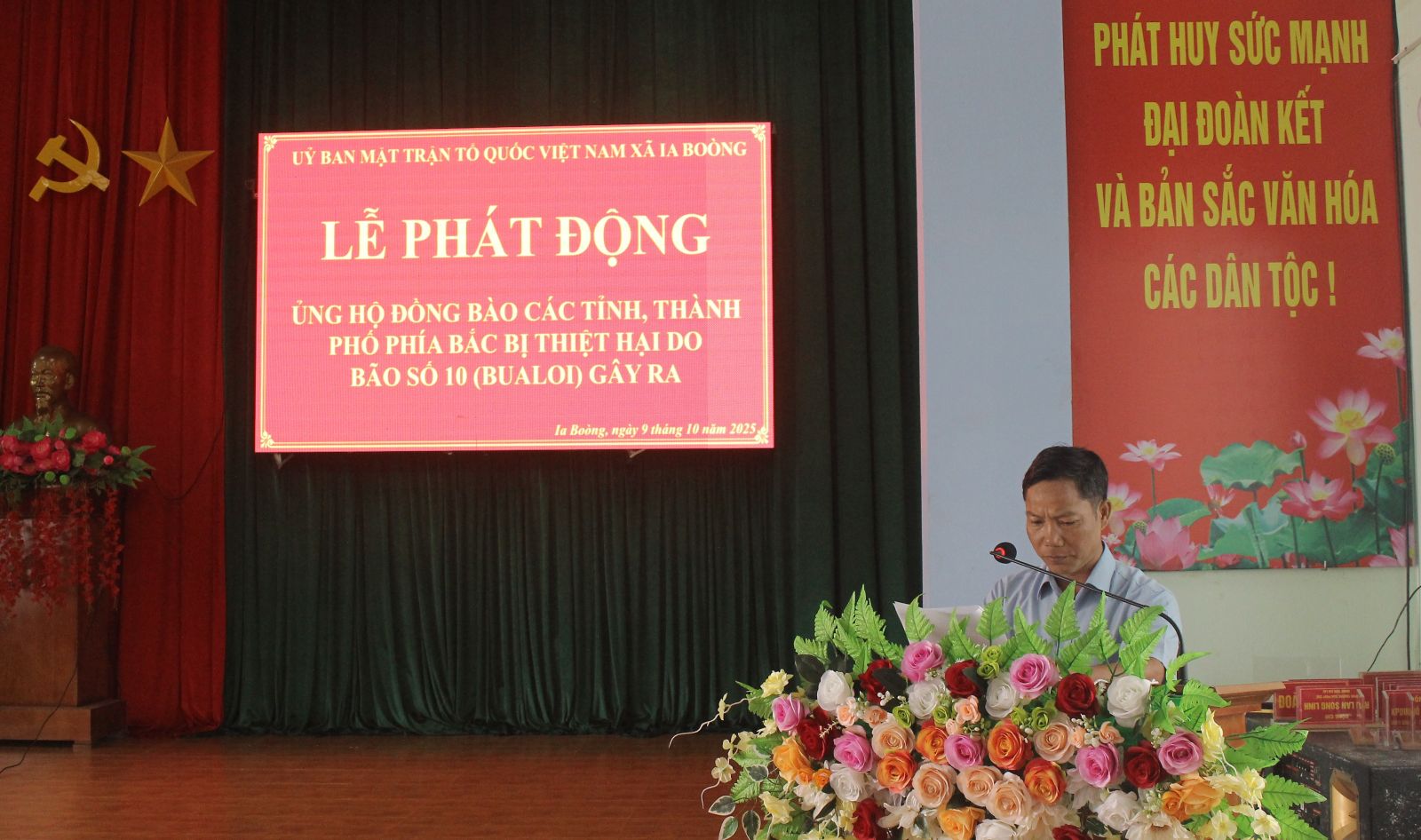 Phát biểu tại lễ phát động, Đồng chí Rơ Siu Hôm - Chủ tịch Ủy ban MTTQ xã Ia Boòng nhấn mạnh: “Phát huy tinh thần tương thân tương ái, lá lành đùm lá rách, mỗi cán bộ, công chức, người dân Ia Boòng hãy cùng góp sức, chia sẻ khó khăn với đồng bào vùng bị thiên tai, giúp họ sớm ổn định cuộc sống và khôi phục sản xuất.”