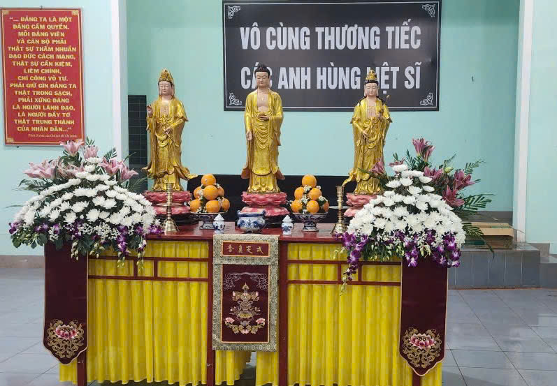 Từ việc dọn dẹp, lau chùi bàn ghế, hội trường Nhà văn hóa; phát cỏ, phát quang bụi rậm xung quanh khuôn viên; chuẩn bị bàn thờ, hương án, hoa trà, lễ vật, hương đèn, ánh sáng, âm thanh, đến trang trí cờ, băng rôn, khẩu hiệu, sắp xếp chỗ ngồi đại biểu, đón tiếp thân nhân liệt sĩ, chư tăng ni và phật tử – tất cả đều được thực hiện một cách tỉ mỉ, trang trọng và đầy tâm huyết.