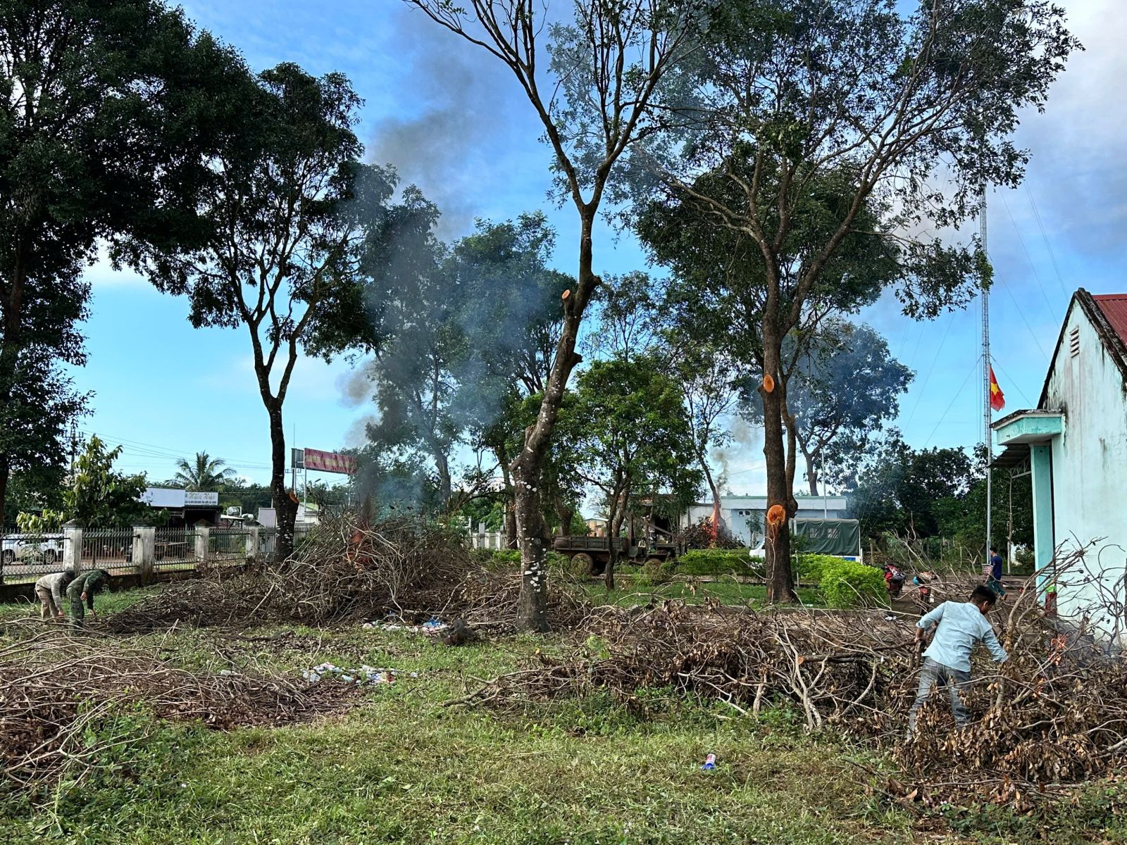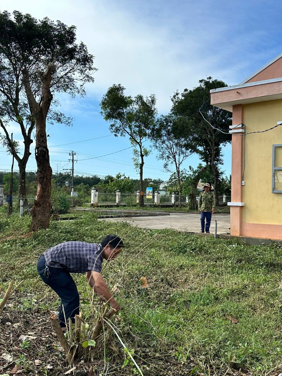 Hình ảnh Hệ thống chính trị xã nhà phối hợp cùng lực lượng dân quân phát quang khuôn viên trước Nhà văn hoá tạo không khí thoáng đãng cho buổi Lễ cầu siêu
